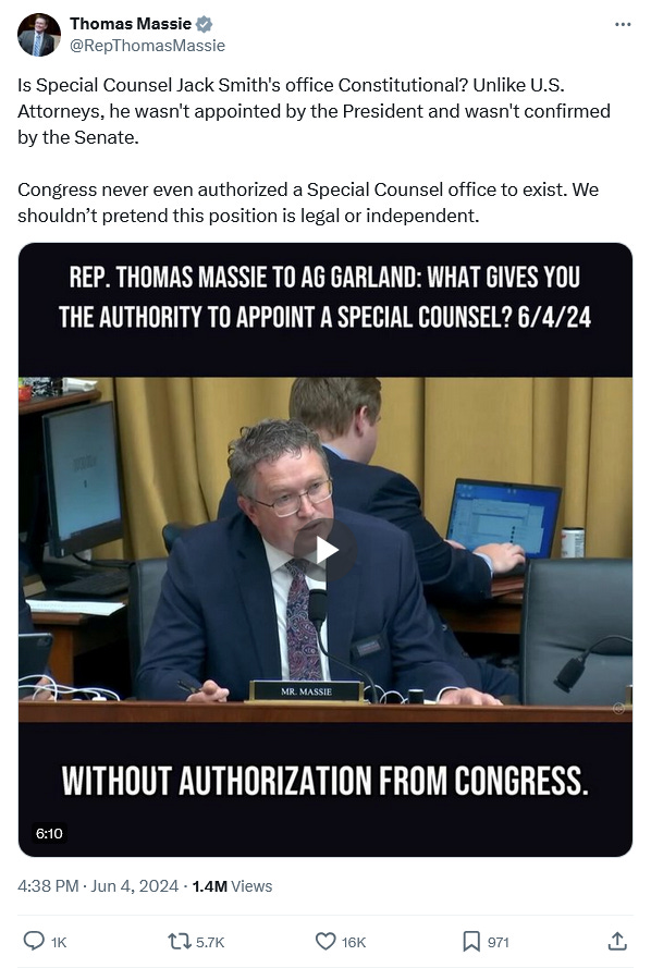 I've read some of the opinion. Clarence Thomas in his concurrence of the POTUS immunity posited likewise. US v Maurice was a precedent as Justice Thomas pointed out. That being said, is it not the Democrats own error that when they controlled the House they did not construct an enabling statute for the Special Counsel? And will the next Congress correct that mistake and construct such a statute for successive administrations?