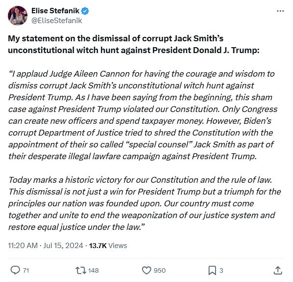 Aside from nearly being assassinated over the weekend, Donald Trump has had a good past few weeks. Still, the best news he’s received yet this month came when Federal District Judge Aileen Cannon dismissed Special Counsel Jack Smith’s classified documents case against him, on grounds that Smith’s Special Counsel appointment is unconstitutional.