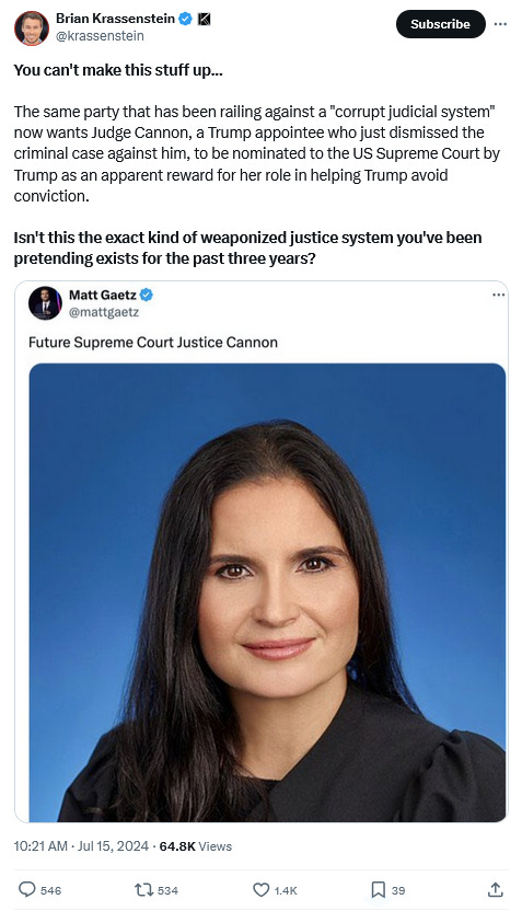 It is conceivable the Supreme Court will overturn Cannon’s ruling and reinstate the documents case against Donald Trump. I do not presume to have any insight how the Court will ultimately rule on the matter. I am certain that this case will be very quickly before the Supreme Court, if only because Cannon has spoken the quiet part out loud, and only the Supreme Court can now put the matter finally to rest one way or the other.