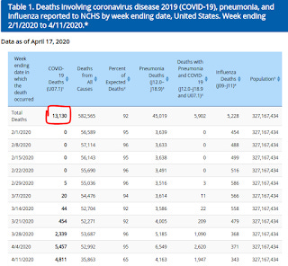 As of April 17, the CDC reported deaths from CCPVirus (COVID-19) as being 13,130 through the week ending April 11.