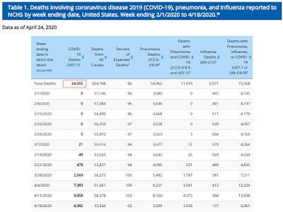 Here we have a problem: The CDC table does not indicate what deaths are "pending" as to cause. It is one thing if data is simply slow to be obtained because of testing bottlenecks. While this is frustrating, it is hardly uncommon. However, those "pending" cases are to be reported to the CDC as "pending" according to the March 24 directive. Either those numbers are not being reported or those numbers are being inaccurately reported elsewhere. There is not a third option available.