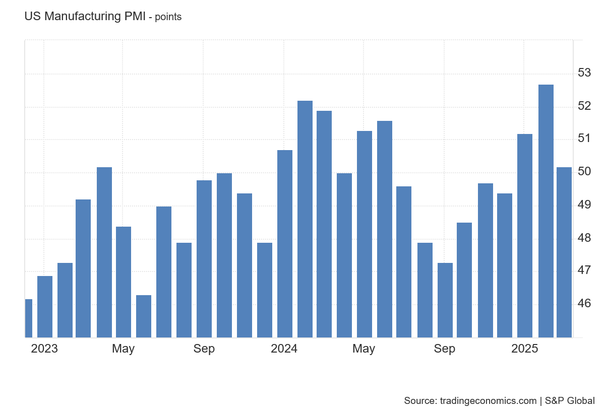 The other PMI data is somewhat mixed. While S&P Global’s Manufacturing PMI data showed a significant drop, at 50.2 it nevertheless remained above the threshold level of 50 where expansion turns into contraction.