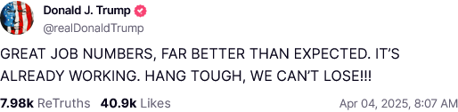 For his part, President Trump was naturally quite happy with the jobs numbers, and was equally happy to take a victory lap for it, which he did on both the whitehouse.gov website and on his Truth Social social media account.