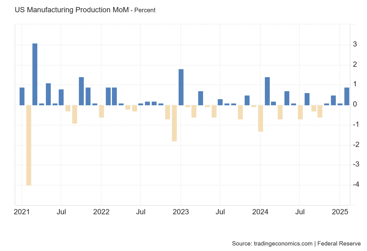 For its part, the Federal Reserve reported manufacturing production increased 0.9% month on month in March.