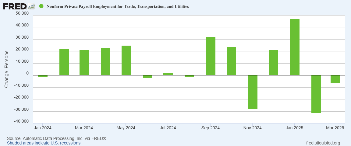 Ironically, the ADP report also deviated from the BLS report by reporting a decrease in Trade, Transportation, and Utilities jobs.