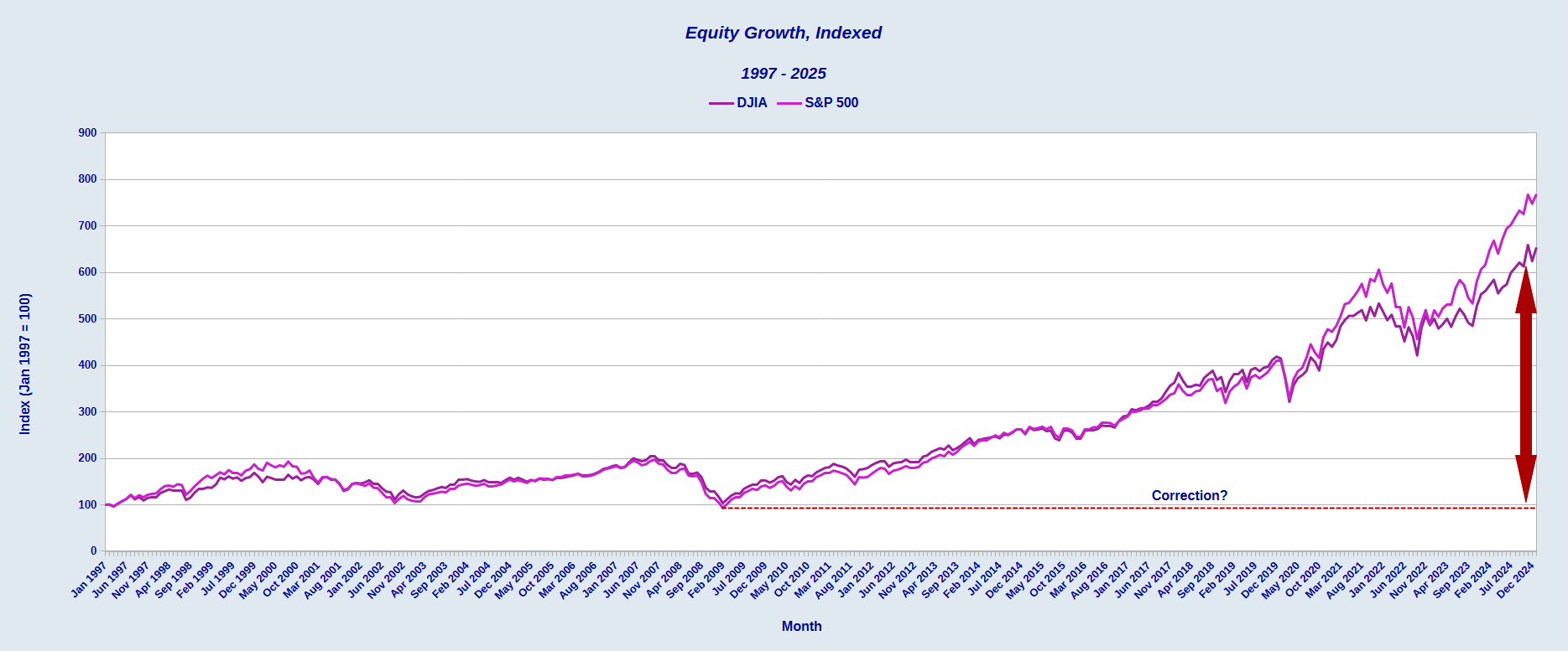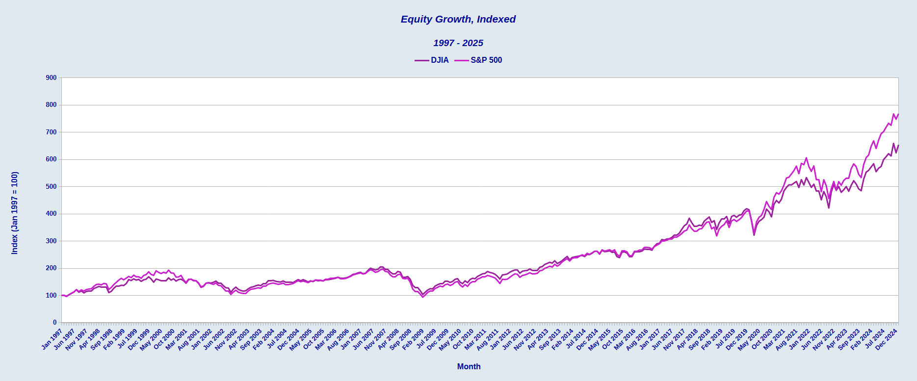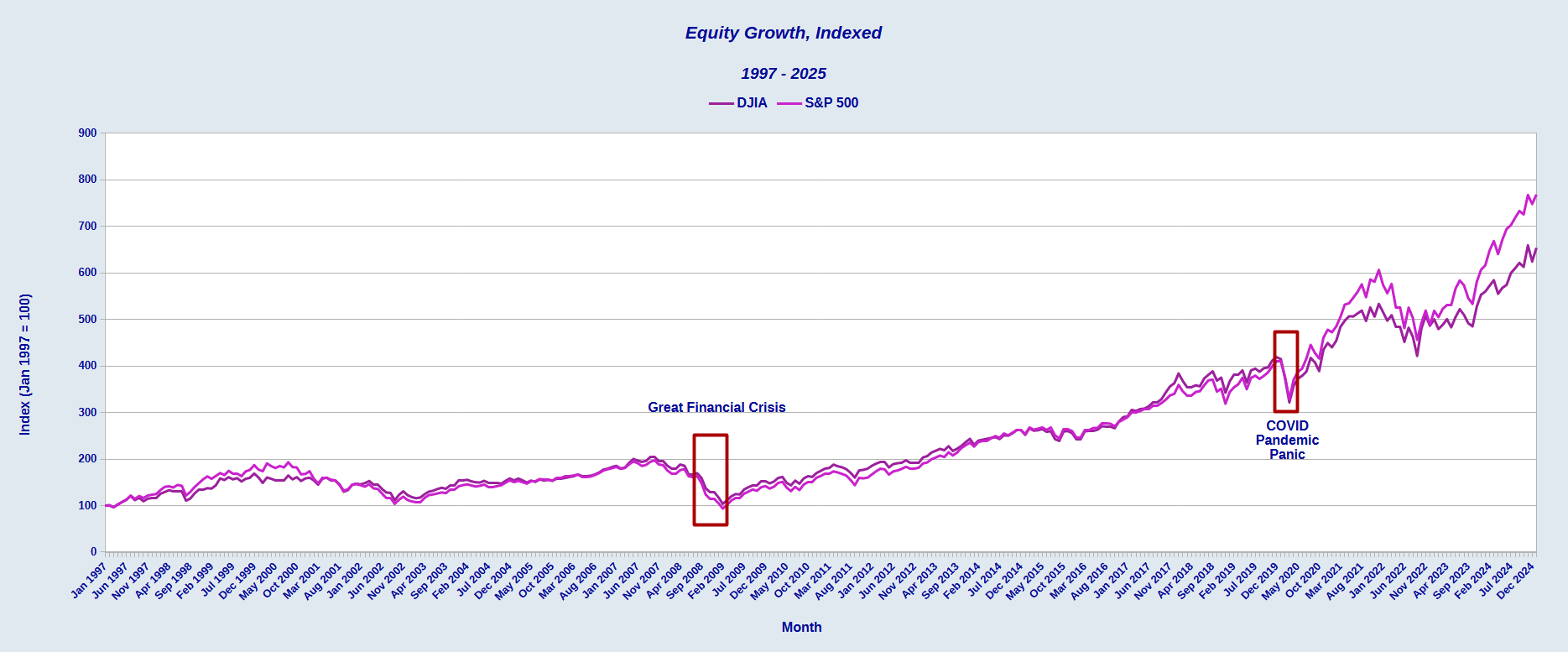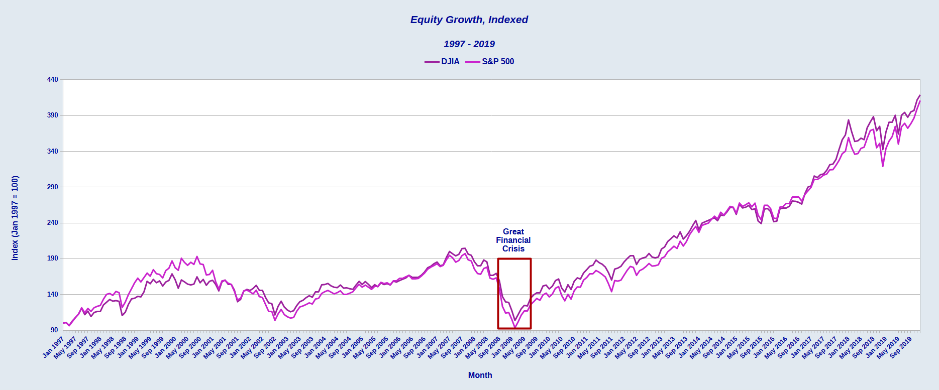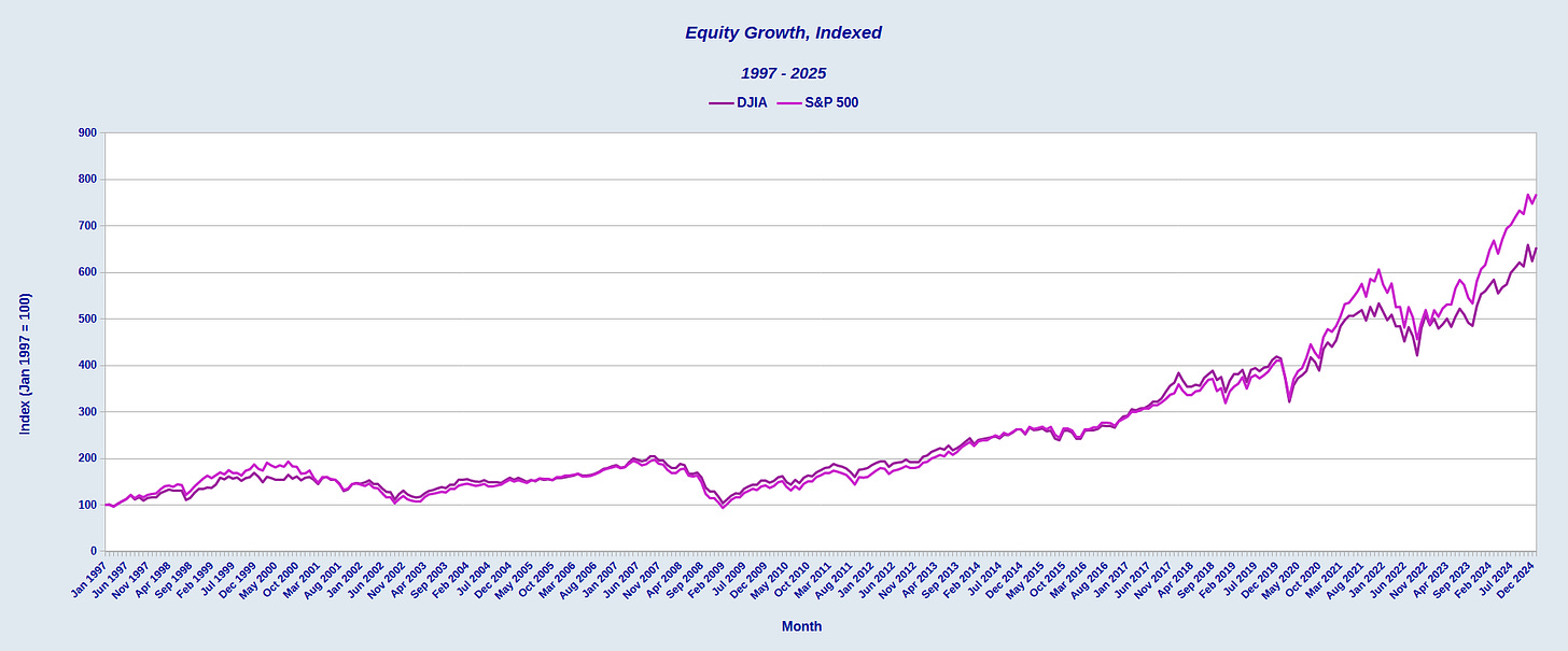 If we take a step back and look how the Dow Jones and the S&P 500 have fared over the years, there is no denying that the stock market has done quite well over time. If we baseline index both the Dow and the S&P 500 to January 1997, we see that the Dow has risen some 600% and the S&P 500 has risen some 700%.