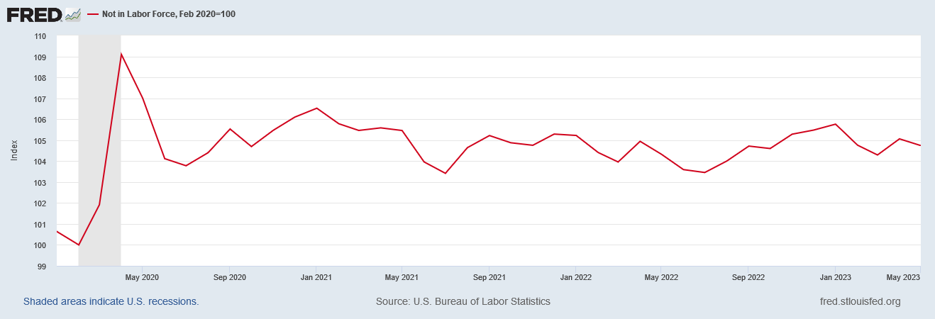 Since June of 2020 there has not been any meaningful improvement in number of workers currently not in the labor force, yet somehow there is ginormous unfilled demand for workers. These are not two concepts that one typically includes in the same logical space.