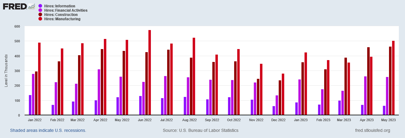 Even though construction and manufacturing jobs are showing some growth in recent months, information and financial activities are, if anything, show a hiring decline.