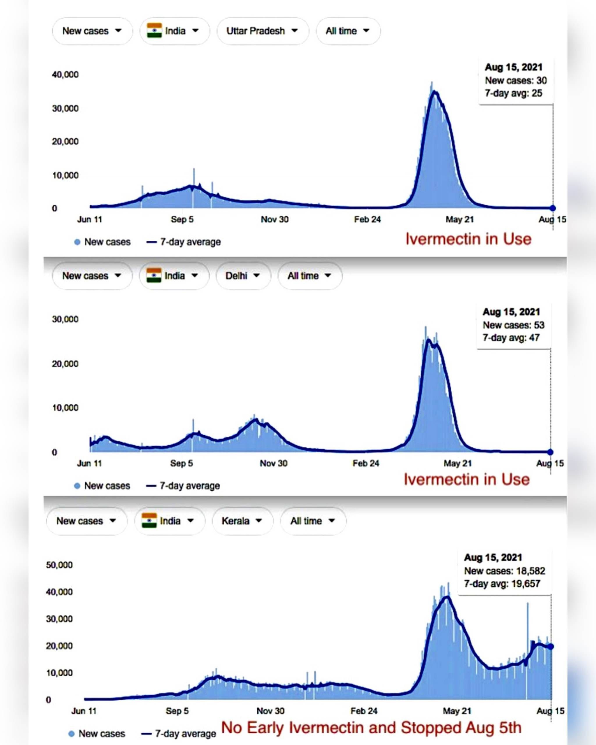India’s experience in fact appears to show that Ivermectin may even achieve superior outcomes to the inoculations. While Utter Pradesh has contained its COVID-19 outbreak, as has the state of Delhi, the much smaller Indian state of Kerala, which has relied more on inculations, has had a much less favorable experience.