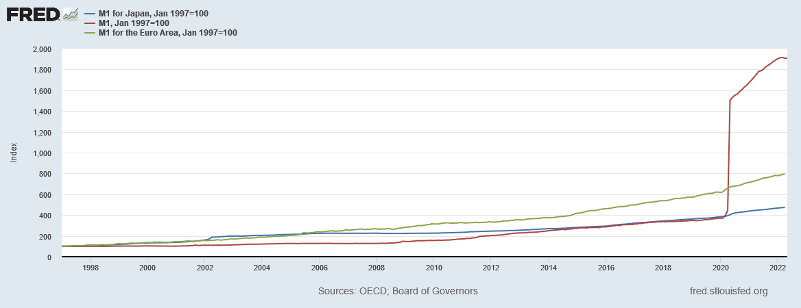 Virtually overnight, the Federal Reserve expanded the M1 money supply by multiple orders of magnitude. The degree of expansion can be seen by the comparison to the much smaller expansions of Japan’s money supply and the money supply of the Euro zone.