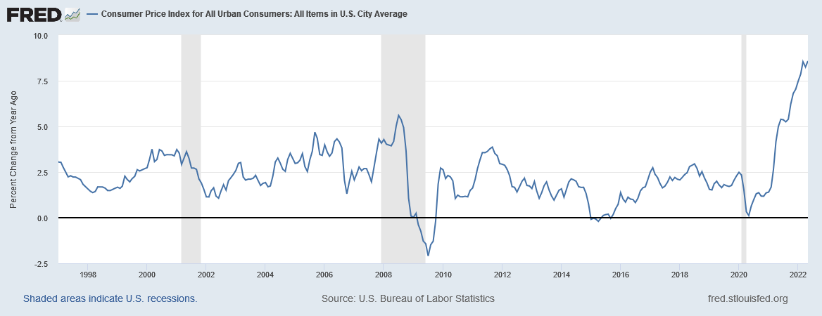Think on that: consumer price inflation is at 8.6%, the highest in decades, and that is after the money supply was increased by over 1000%! By comparison, inflation during the 2008 recession peaked at 5.6%, largely before the magic money printing press was started.