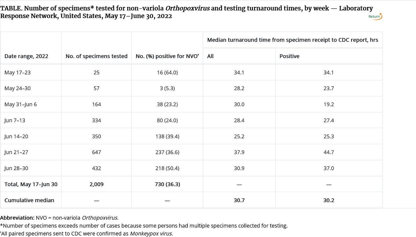 Non-Variola Orthopoxvirus (NVO) testing is largely being performed through the Laboratory Response Network3, which between 17 May and 30 June conducted 2009 tests, 730 of which returned positive for NVO (test positivity rate 36.3% overall). However, when the tests are broken down week by week, there is a trend of increasing test positivity over time.