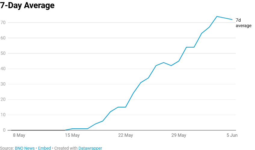 The 7-day average of non-endemic monkeypox cases as reported by BNO News indicates the virus has been spreading more aggressively outside of Africa.