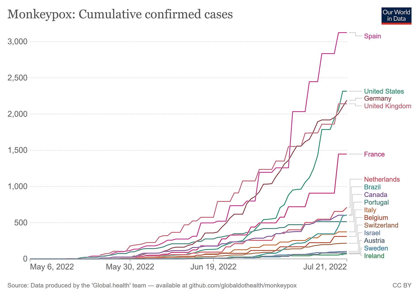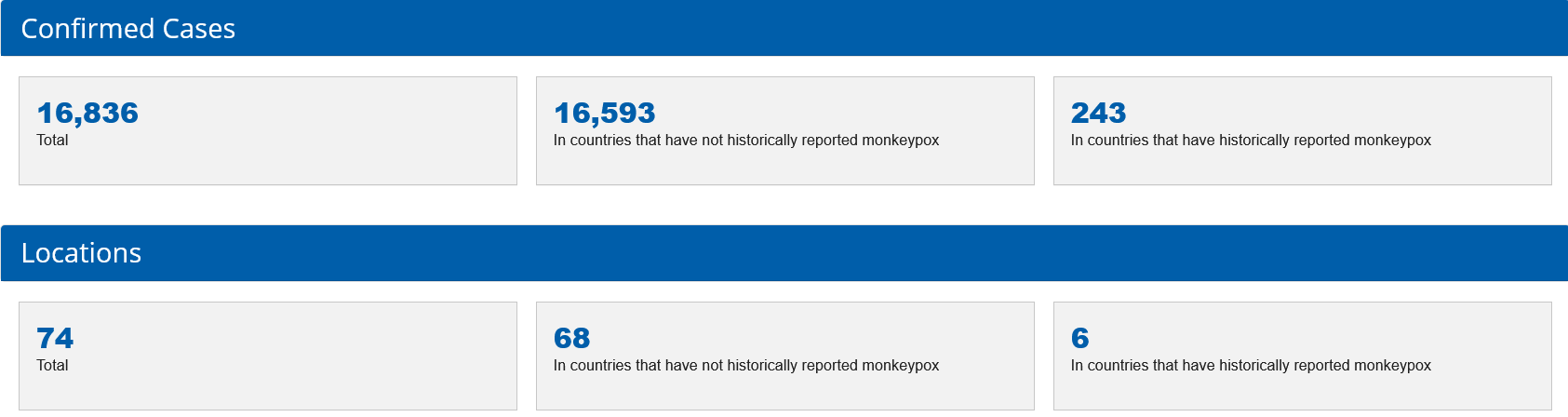 As of 22 July, the US CDC reported 16,836 cases of monkeypox worldwide, with 16,593 cases in countries where the disease is not historically endemic.