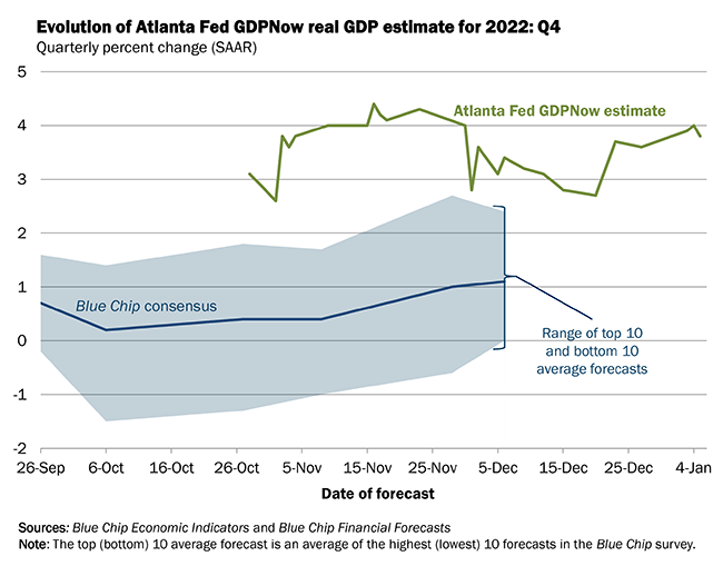 The GDPNow model estimate for real GDP growth (seasonally adjusted annual rate) in the fourth quarter of 2022 is 3.8 percent on January 5, down from 3.9 percent on January 3. After recent releases from the Institute for Supply Management, the US Bureau of Economic Analysis, and the US Census Bureau, the nowcasts of fourth-quarter real personal consumption expenditures growth and fourth-quarter real gross private domestic investment growth decreased from 3.6 percent and 6.1 percent, respectively, to 3.2 percent and 5.8 percent, respectively, while the nowcast of the contribution of the change in real net exports to fourth-quarter real GDP growth increased from 0.17 percentage points to 0.35 percentage points.