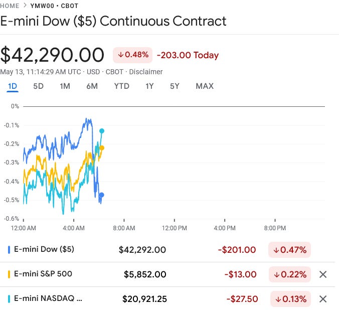 For its part, Wall Street is holding off on a repeat of yesterday’s enthusiasm pending the April CPI print, with stock futures ticking down ahead of the opening bell.
