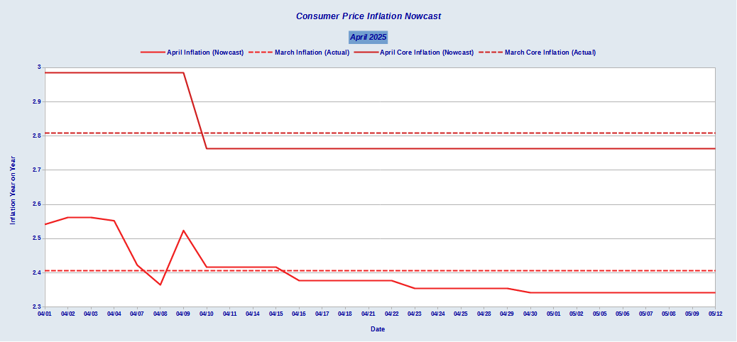 The Cleveland Federal Reserve’s InflationNow nowcast aligns with the Wall Street forecast, anticipating year on year consumer price inflation of 2.34%.