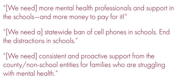 • The three most-selected perceived root causes of student mental health challenges were: trauma experienced firsthand (primary trauma) (74% of respondents selected this option), student engagement with social media (59%), and mental health challenges of caregivers (40%).
