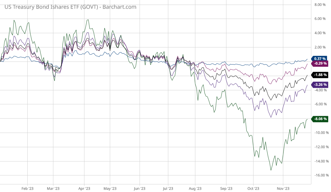 Even for the first eleven months of 2023, longer-term bonds have performed horribly as an investment relative to shorter-term bonds.