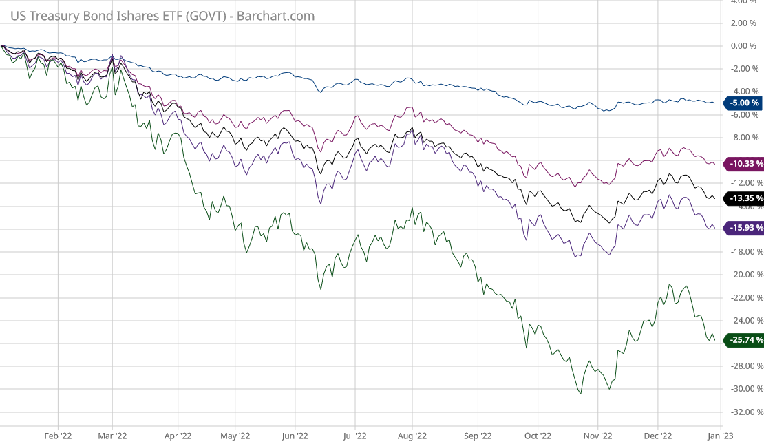 However, this view does not reconcile to even the 2022 performance of Treasuries in the marketplace. When we look at the performance of Exchange Traded Funds focused on government securities we see that the longer term bonds hemorrhaged value, while the shorter term bonds held comparitively greater value (i.e., they lost less).