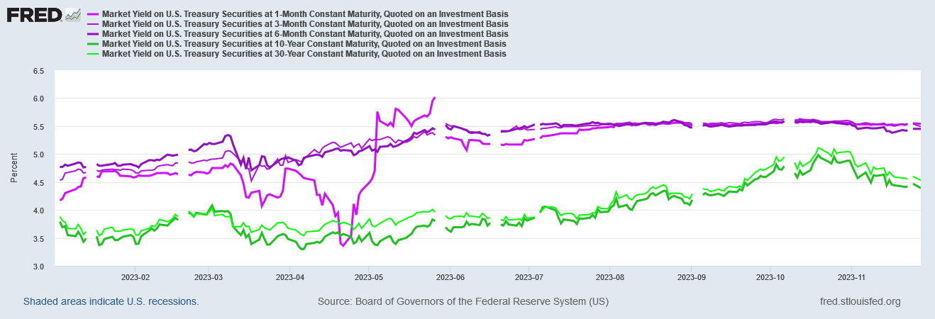 However, even this view is at odds with some key pieces of data—term interest rates themselves. Even if we accept the initial position of short term yields being higher than longer term yields, money flowing into short-term securities and out of longer-term securities should push down short-term yields and prop up longer-term yields. That has not happened in 2023.