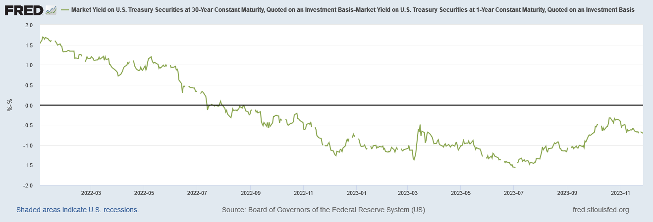 The inversion between the 30-Year Treasury and the 1-Year Treasury began a day later, on July 13: