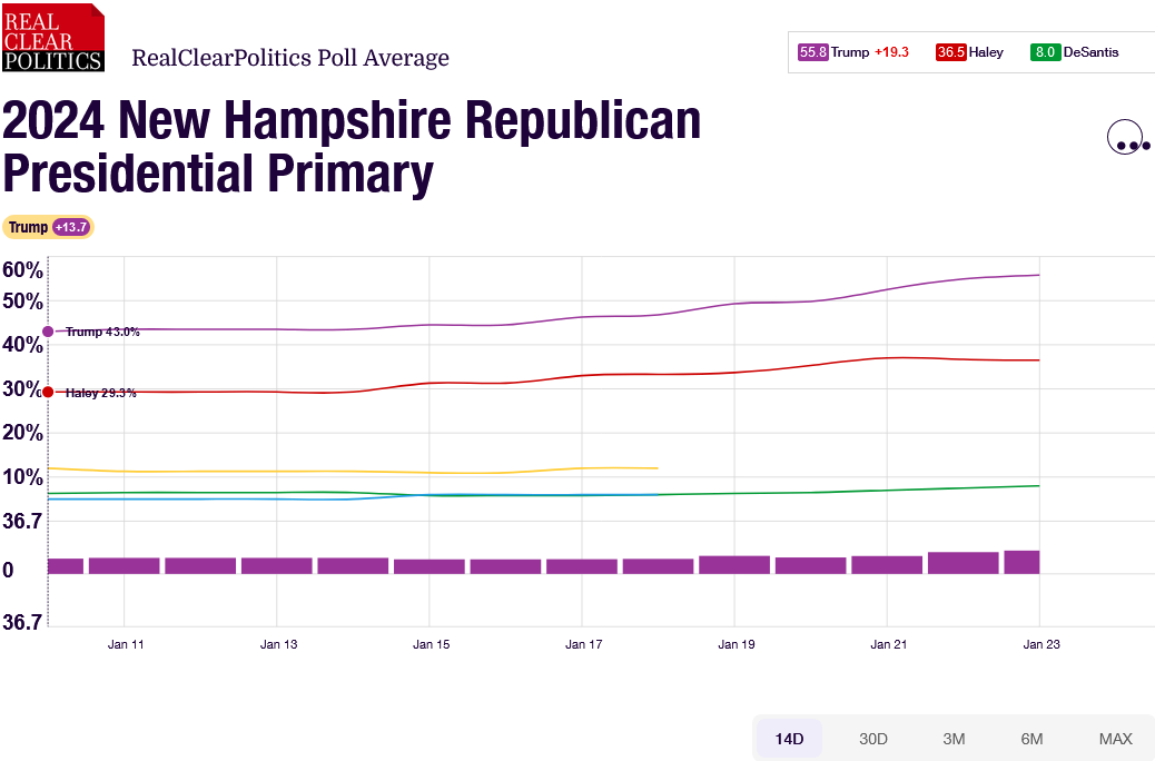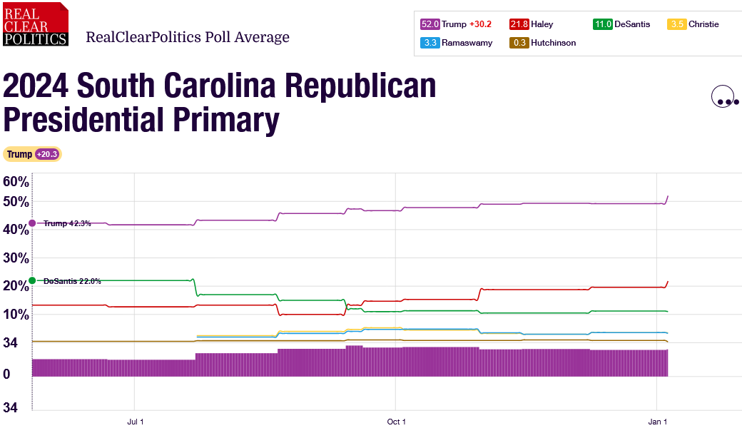 When we look at the polling data, it is not hard to see why Trump is by far the odds-on favorite. In the most recent Real Clear Politics Polling aggregate, Donald Trump has expanded his lead over Nikki Haley by three or four percentage points in the past few days.