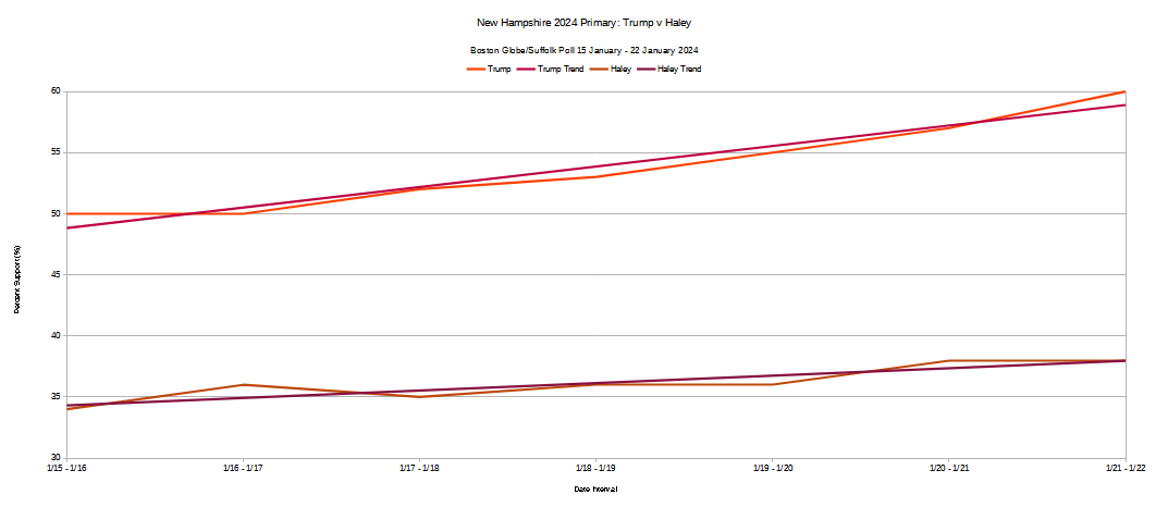 The one series of polls that does have enough data points to begin looking at trend lines, the Boston Globe/Suffolk poll, not only shows Trump in the lead, but that Trump’s rise in voter popularity is greater than Nikki Haley’s rise.