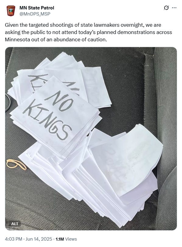 Significantly, among the materials recovered from the shooter’s abandoned vehicle by the Brooklyn Park and Minnesota State Patrol were a number of “No Kings” flyers. The Minnesota State Patrol publicly requested people to stay away from any “No Kings” protests planned for today.