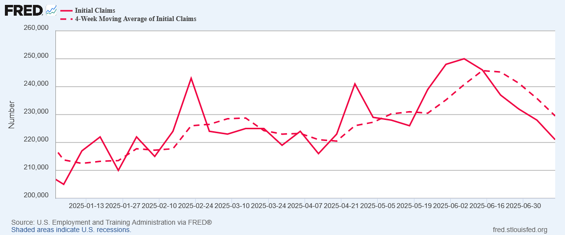 In the week ending July 12, the advance figure for seasonally adjusted initial claims was 221,000, a decrease of 7,000 from the previous week's revised level. The previous week's level was revised up by 1,000 from 227,000 to 228,000. The 4-week moving average was 229,500, a decrease of 6,250 from the previous week's revised average. The previous week's average was revised up by 250 from 235,500 to 235,750.