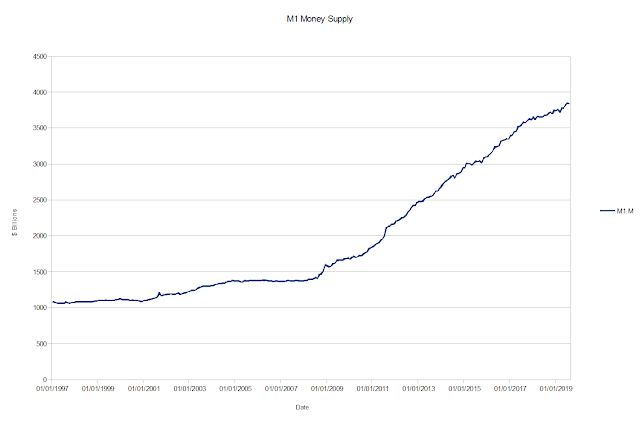 I began by focusing on the reported size of the money supply from the Fed, looking at both the M1 and M2 numbers. The M1 money stock figure is that amount of money readily available for spending--physical currency and deposits in various on-demand bank accounts--whereas the M2 figure includes "near money" accounts such as various money market accounts and time deposit instruments. There had been a third figure, the M3, which included an even broader array of money equivalents, but reporting of that figure was discontinued by the Federal Reserve in 2006.