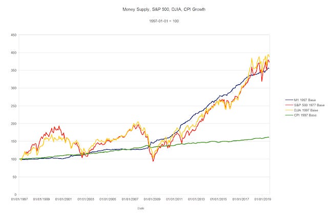 Prior to 2008, CPI and the M1 track very closely together, with only minor and transient deviations. The stock market indices, however, show absolutely no correlation to changes in the money supply. The stock bubbles of 2000 and 2008 occurred without any dramatic expansion in the M1 money supply.
