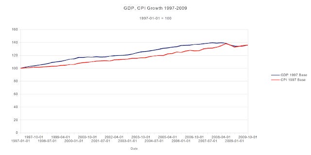 These graphs show that, since 2008, there is a strong and persistent correlation between Real GDP and inflation via the CPI. Only very recently do the graphs deviate from each other. If Real GDP fully accounted for inflation, we should see significant variations between the trend lines, and we do not. We see this lack of correlation between 1997 and 2008, but the trend lines converge in 2008.