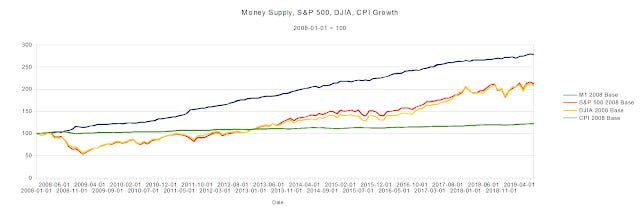 After 2008, however, the exact opposite is true. The stock indices move along roughly the same upward slope as the M1 money supply, and the CPI continues on its same roughly linear trajectory completely divorced from the money supply. Only in 2017 do the stock indices show any sign of breaking free from the M1 trajectory.