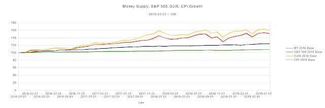 The deflationary sag in 2008 is of course the consequence of the financial crisis in that year and the onset of the "Great Recession". Yet the deflationary "sag" never really disappears, as both the CPI and the stock indices run below the M1 growth level, and to an increasing degree over time. The influx of dollars into the economy did not produce a corresponding level of inflation even within financial markets. Moreover, if we were to flatten out the M1 chart (i.e., express the money supply in terms of constant dollars), we would see the stock indices as well as the CPI declining. This would be especially true after the formal end of quantitative easing, where we see the M1 trend line essentially unchanged but the S&P 500 and DJIA lines appear to flatten out for a time