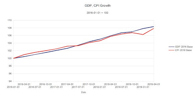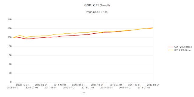 As the earlier graphs show, when we start from 2008 and 2016, Real GDP and CPI lie on very similar lines, and only in 2017/2018 do we begin to see any significant variation.