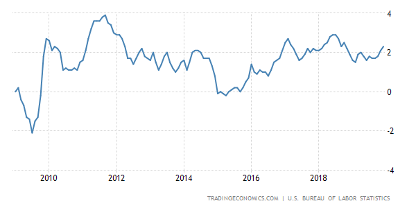 Another curious aspect of the Fed's quantitative easing program was that it failed to produce significant inflation. As this chart from Trading Economics shows, inflation during the past ten years has only rarely been above 2%, and only briefly below 0% (deflation) during 2008/2009.