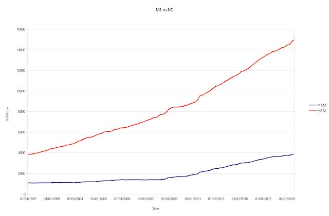 One point that is fascinating about the M2 curve was that there was no dramatic spike up beginning in 2008/2009, when the Federal Reserve instituted quantitative easing policies in response to the 2008 financial crisis. "Quantitative Easing" is broadly defined as an expansion of a central bank's open market operations, which are specifically intended to increase the money supply. There is an upward trend in the the M1 figure, but in moving from the M1 measure to the M2, the increase in money effectively disappears.