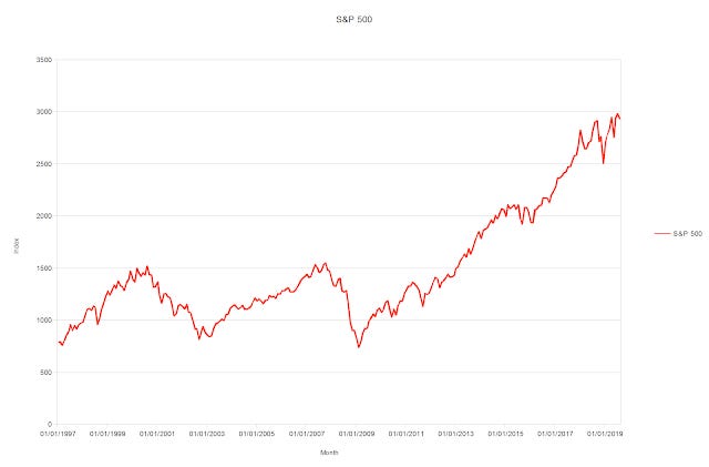 After giving up all of the gains made between 1997 and 2008, the S&P began climbing steadily starting in 2008, and has largely kept on climbing.