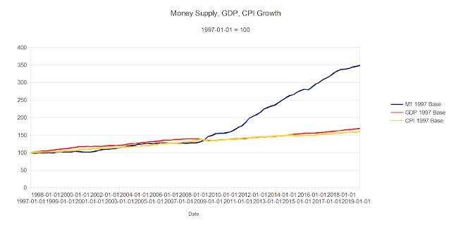 Having arrived at that conclusion, the next step was to test the conclusion using an independent metric. For this I downloaded the reported Real GDP data from the St Louis Federal Reserve for the same time period, January 1, 1997 to the present, and charted it against money supply growth, again using a baseline of January 1, 1997.