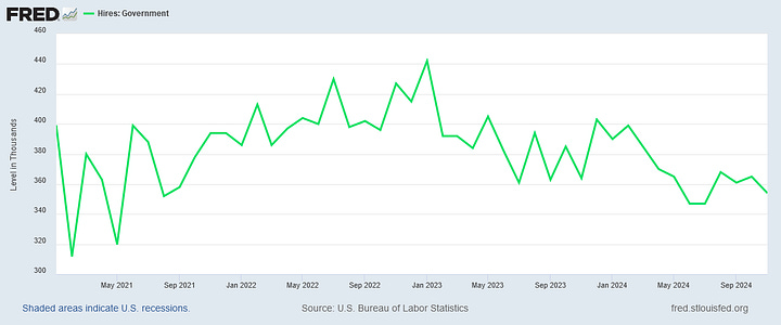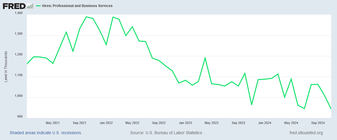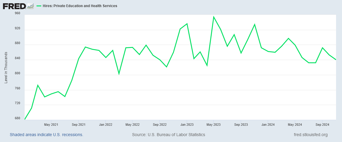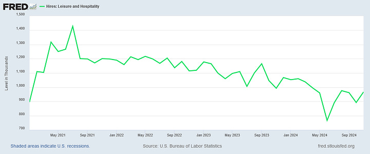While Private Education and Health Services had been trending up earlier in the (Biden-)Harris Administration, for 2024 the hiring trend has been down, and that trend was continued in November.