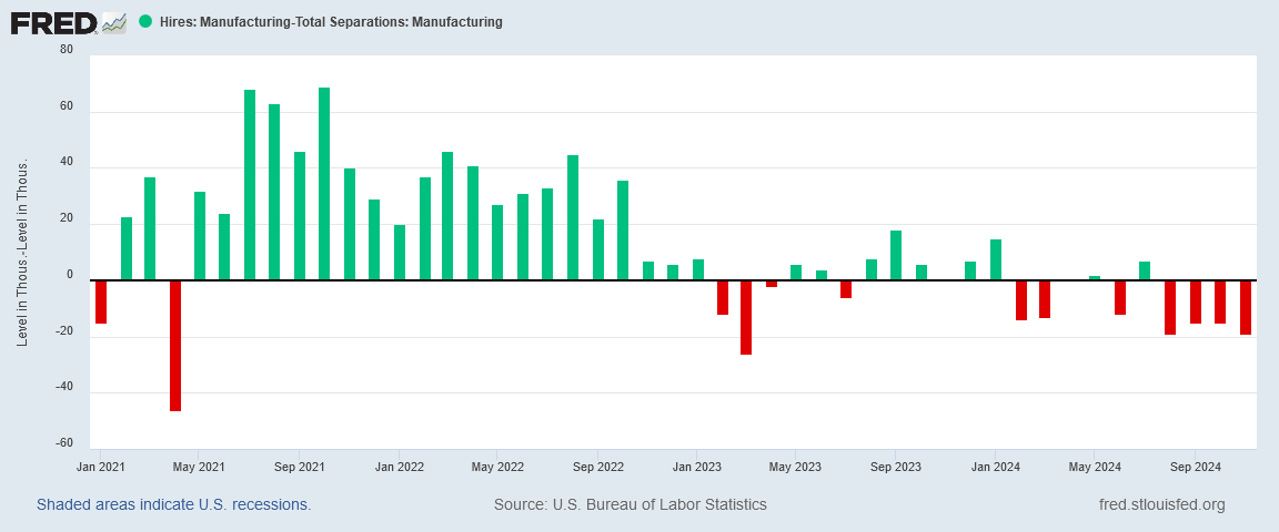 If we zoom in on 2024, we can see that net hiring for manufacturing has been negative almost all year.