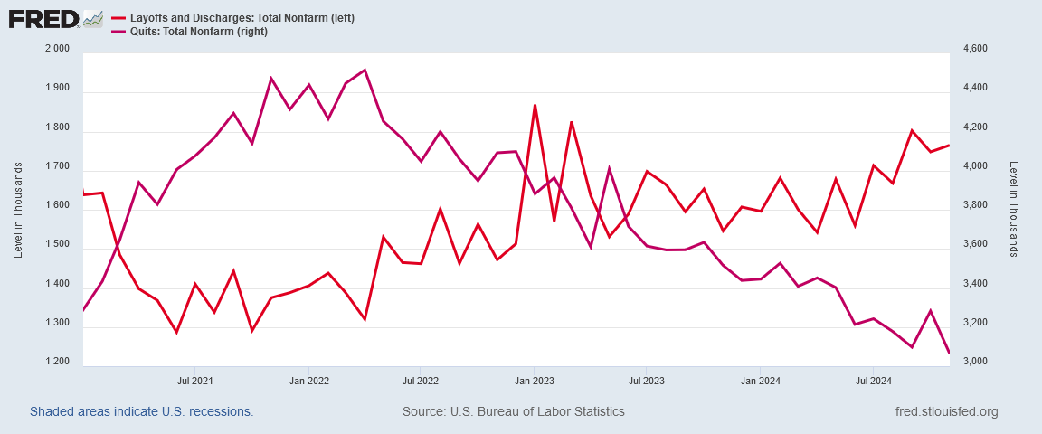 The November JOLTS report does not show employment to be increasing. Rather, the report shows that employment has been steadily decreasing. The report shows that layoffs are rising even as quits are falling—a plausible interpretation for this is that enough people are getting fired to make everyone else more reluctant to risk a job switch.