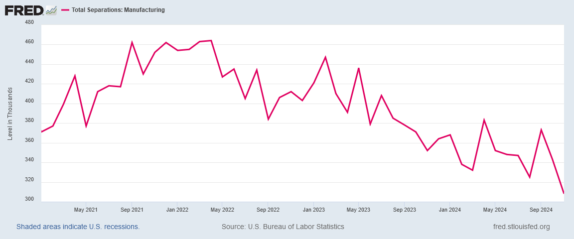 The decline in hires made it a cold comfort that total separations in manufacturing were down as well.