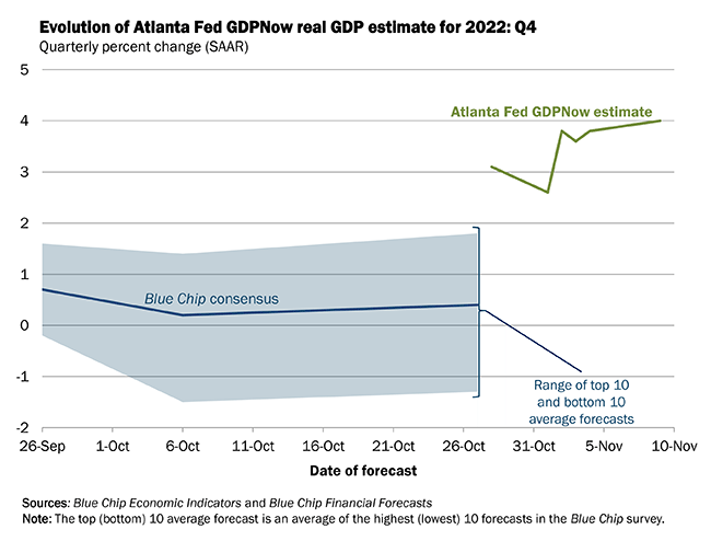The GDPNow model estimate for real GDP growth (seasonally adjusted annual rate) in the fourth quarter of 2022 is 4.0 percent on November 9, up from 3.6 percent on November 3. After last week's employment situation report from the US Bureau of Labor Statistics and this morning's wholesale trade report from the US Census Bureau, the nowcasts of fourth-quarter real personal consumption expenditures growth and fourth-quarter real gross private domestic investment growth increased from 4.0 percent and 0.7 percent, respectively, to 4.2 percent and 2.1 percent, respectively.