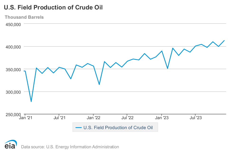 It is worth noting that, despite various disruptions to global oil supply, from Russia sanctions to OPEC production cuts to Houthi missiles, one trend that has been consistent since 2021 has been rising oil production here in the US.
