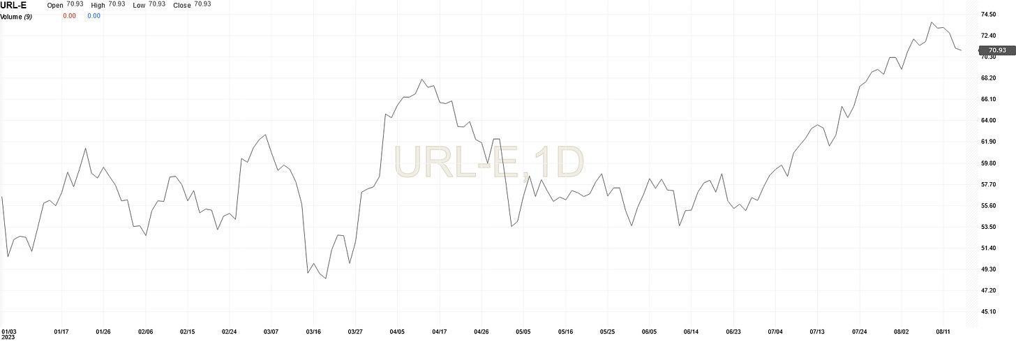 Even Russia’s benchmark Urals crude, which blew apart the EU/NATO price cap weeks ago, is trading well above previous 2023 prices.