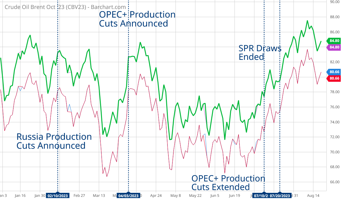 Barely a week after OPEC announced its production cuts, oil prices peaked, with Brent Crude posting its highest 2023 closing price before August 9 at $84.65/bbl.