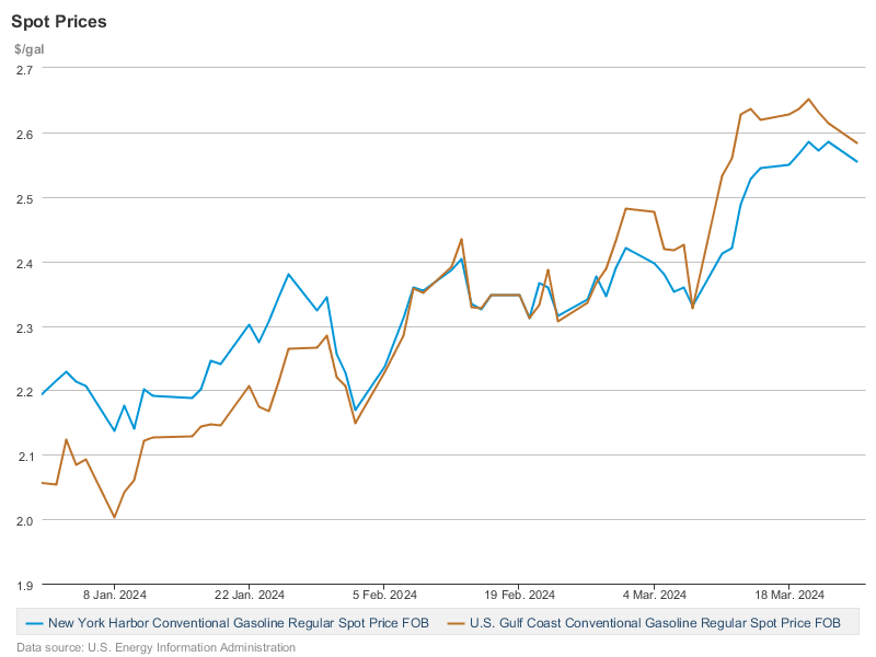 Spot prices for gasoline are moving in largely the same patterns and direction