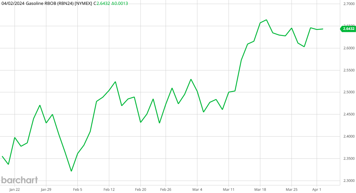 Unsurprisingly, as oil prices go so too go gasoline prices, and that is largely what we have seen, with gasoline futures climbing steadily since the first of the year.